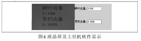 該程序主要用于實(shí)時更新流量信息,微處理器與上位機(jī)通過RS232接口以modbus協(xié)議進(jìn)行通信。*后,該設(shè)計液晶屏上所顯示的流量信息與上位機(jī)軟件所顯示的數(shù)據(jù)如圖4所示。