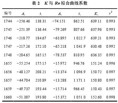 利用雙指數衰減函數對儀表系數與雷諾數關系進行擬合,在層流范圍內(Re<2300),儀表系數隨Re增加迅速增加,尤其是在Re<1000范圍內更加明顯;而在Re>3000紊流范圍內,儀表系數變化平緩,接近常數;在10003000的穩定儀表系數。